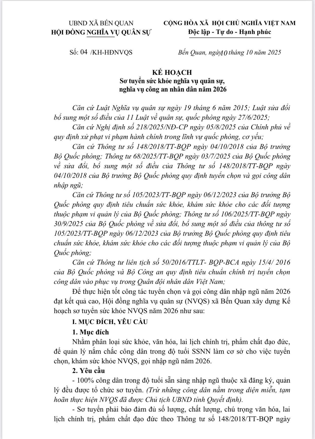 KẾ HOẠCH SƠ TUYỂN SỨC KHỎE NGHĨA VỤ QUÂN SỰ, NGHĨA VỤ CÔNG AN NHÂN DÂN NĂM 2026