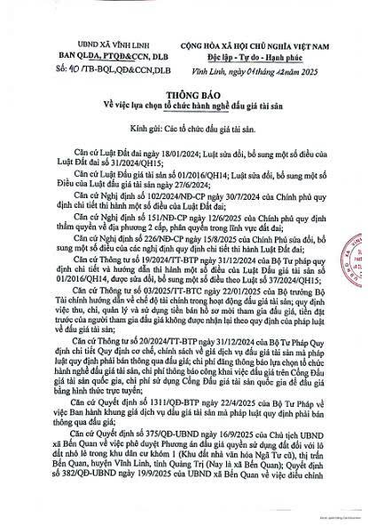 THÔNG BÁO SỐ 40 VỀ VIỆC LỰA CHỌN TỔ CHỨC HÀNH NGHỀ ĐẤU GIÁ TÀI SẢN