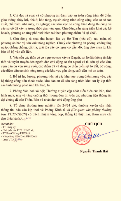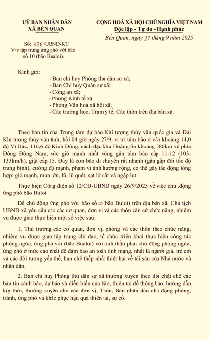 UBND xã Bến Quan yêu cầu các cơ quan, đơn vị, trường học, ban điều hành các thôn, bản trên địa bàn tăng cường tập trung ứng phó với bão số 10 (Bão Bualoi)