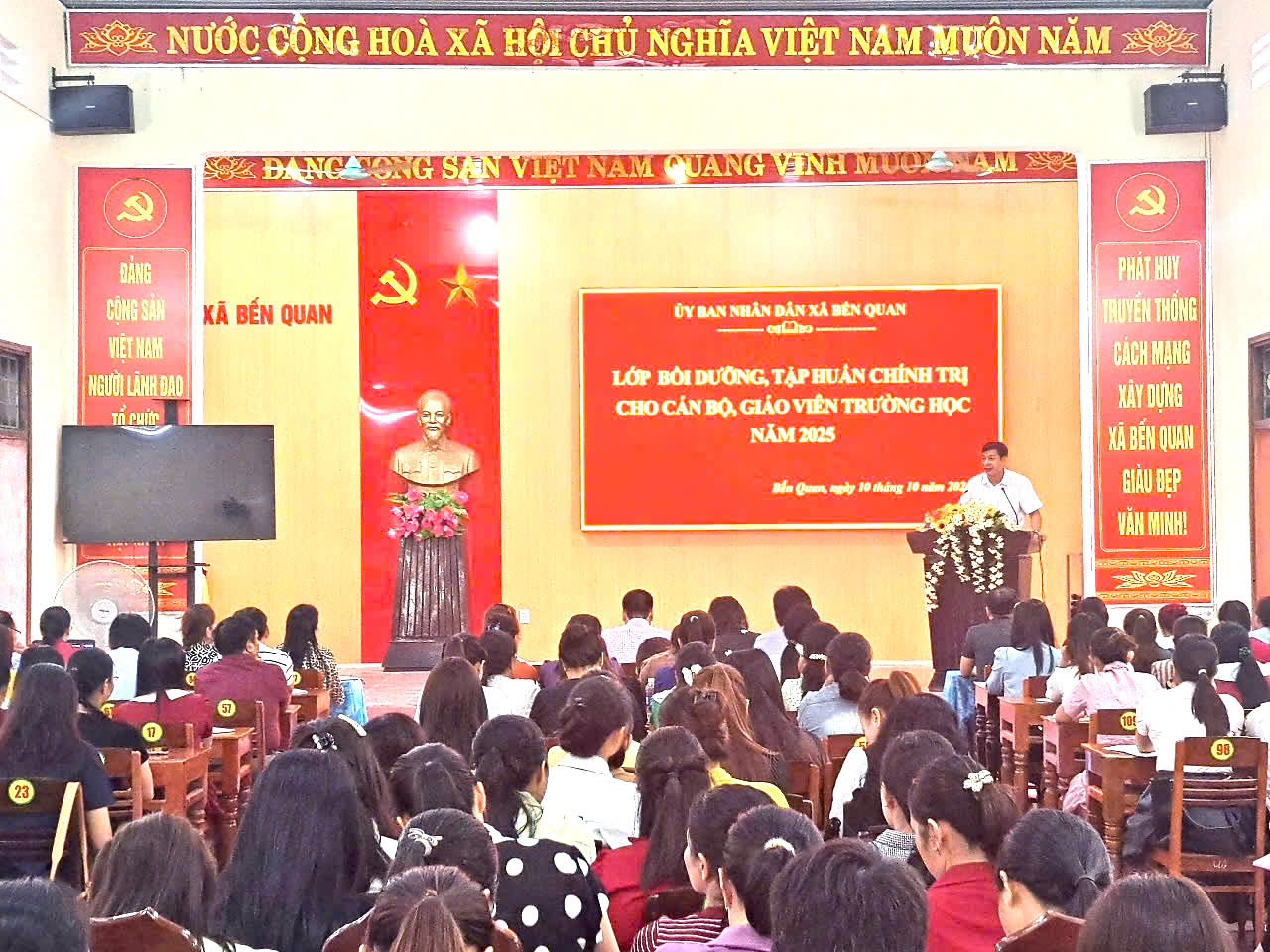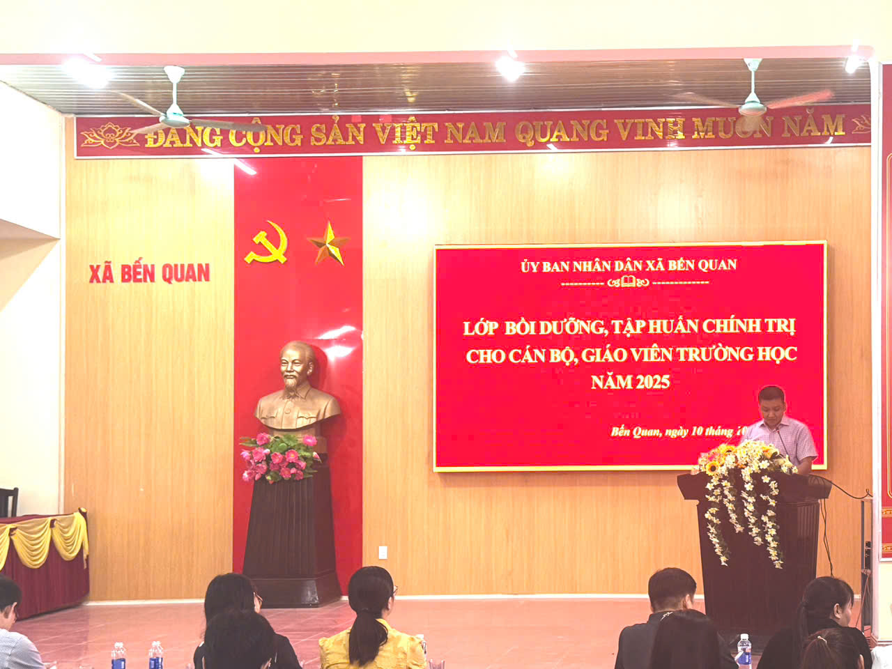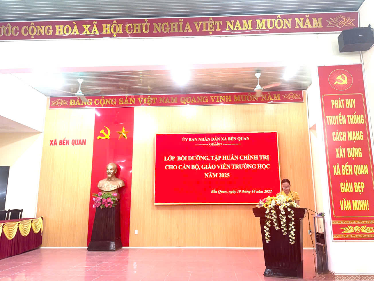 Sáng ngày 10/10/2025, UBND xã Bến Quan đã tổ chức lớp bồi dưỡng, tập huấn chính trị dành cho đội ngũ cán bộ, giáo viên các trường học trên địa bàn xã, nhằm nâng cao nhận thức chính trị, tư tưởng và đạo đức nghề nghiệp cho năm học 2025.