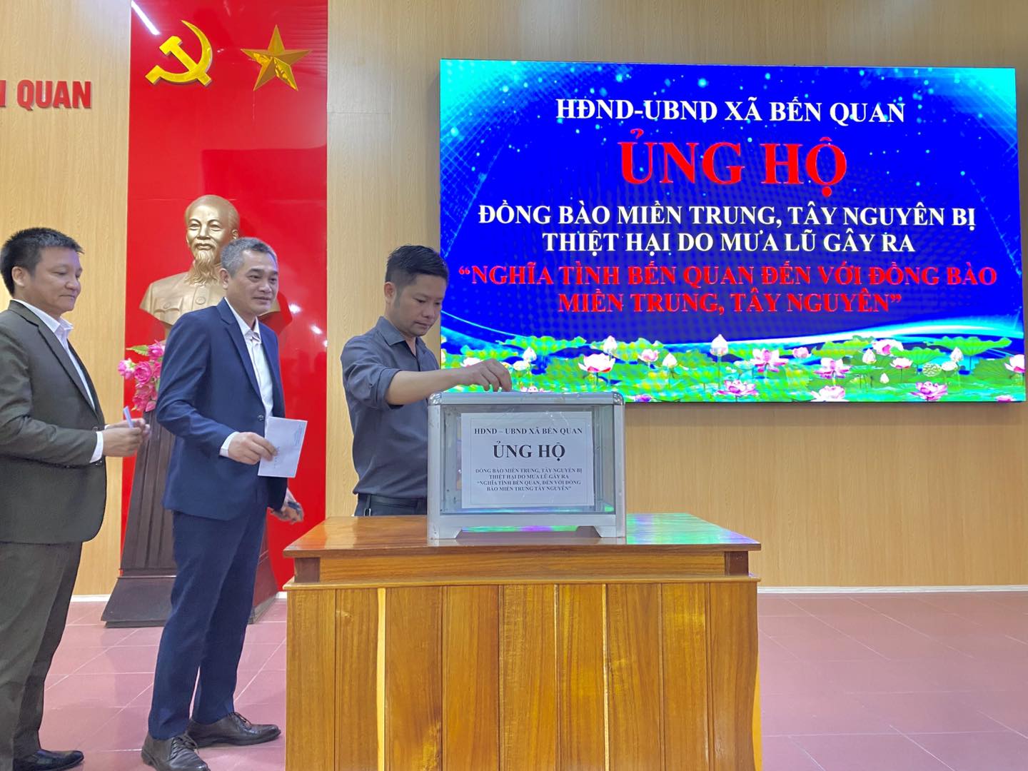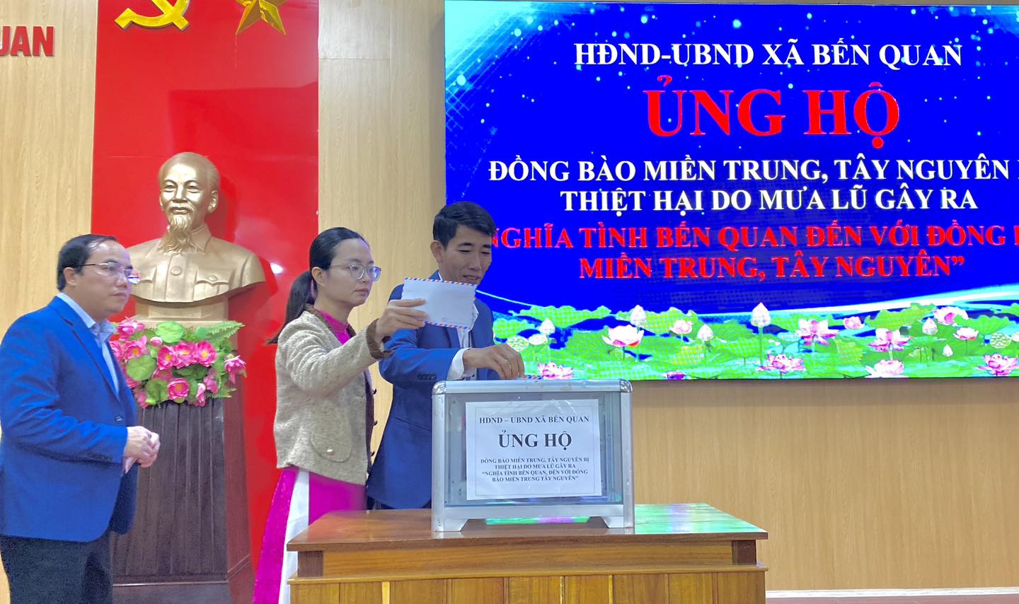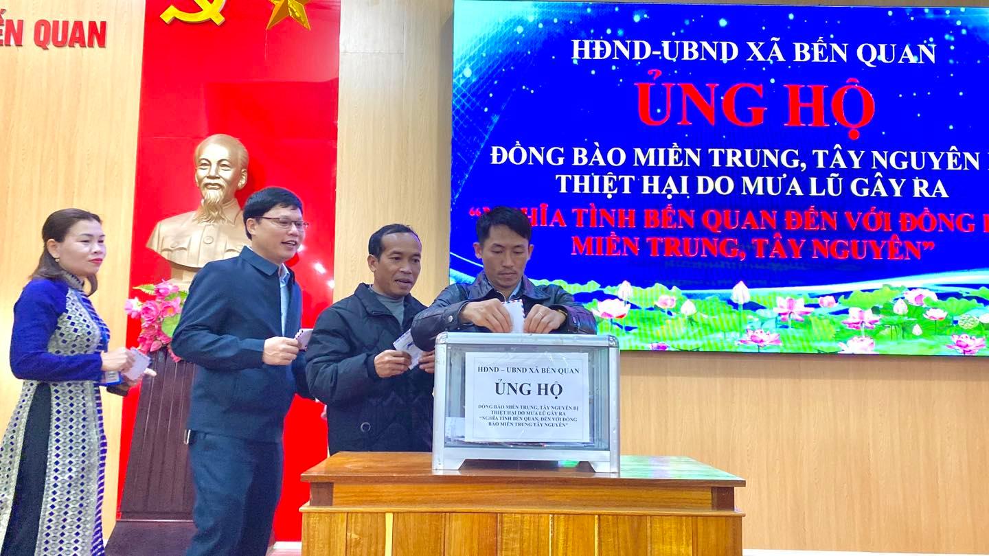 Từng lượt cán bộ, công chức lần lượt lên ủng hộ, gửi gắm trong mỗi phần đóng góp không chỉ là vật chất mà còn là tấm lòng của quê hương Bến Quan hướng về những nơi đang oằn mình trong mưa lũ. Xã Bến Quan tin tưởng rằng những phần quà nhỏ được gửi đến bà con miền Trung Tây Nguyên sẽ là một phần động lực giúp bà con vực dậy tinh thần sau những khó khăn, mất mát do mưa lũ gây ra.