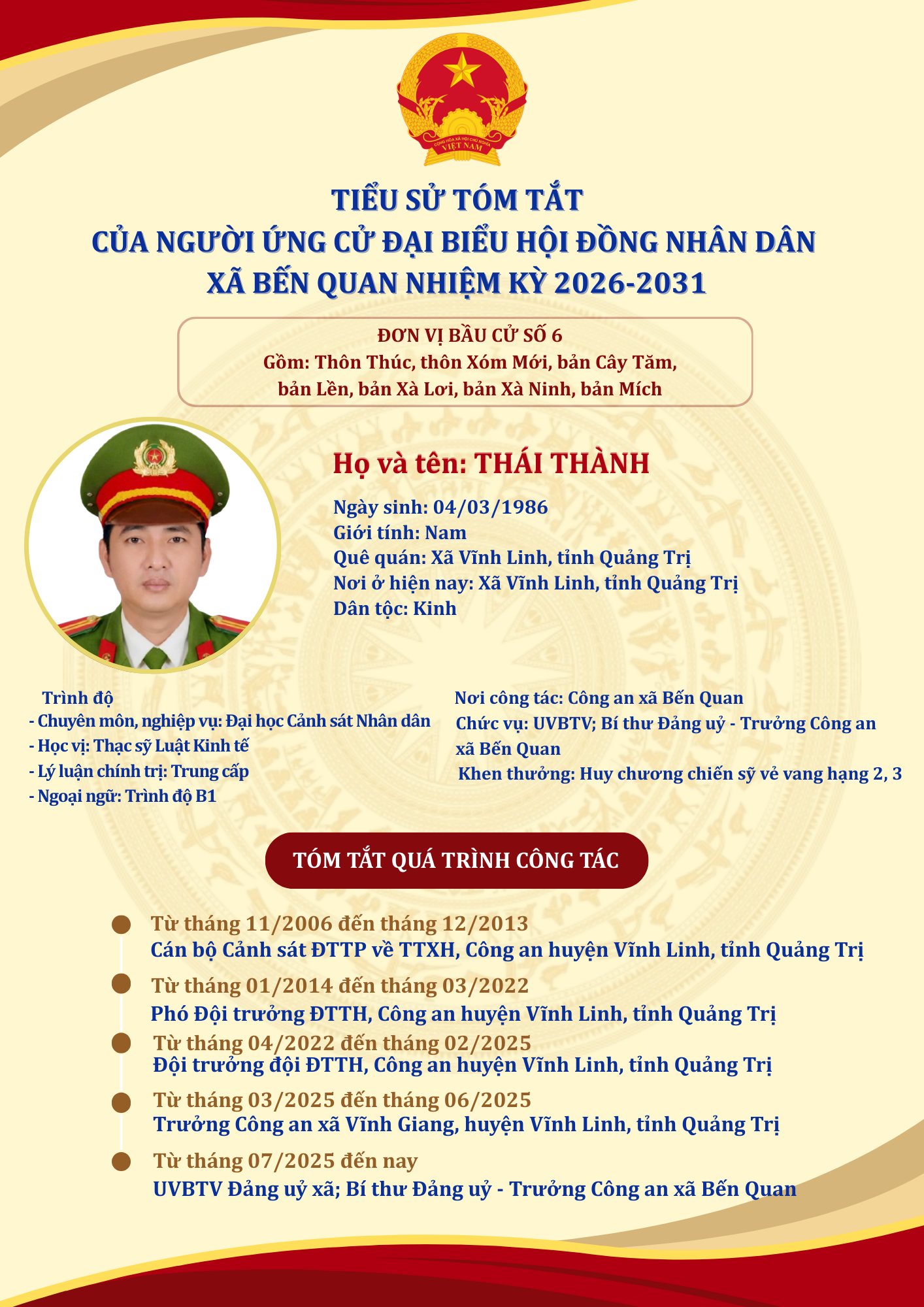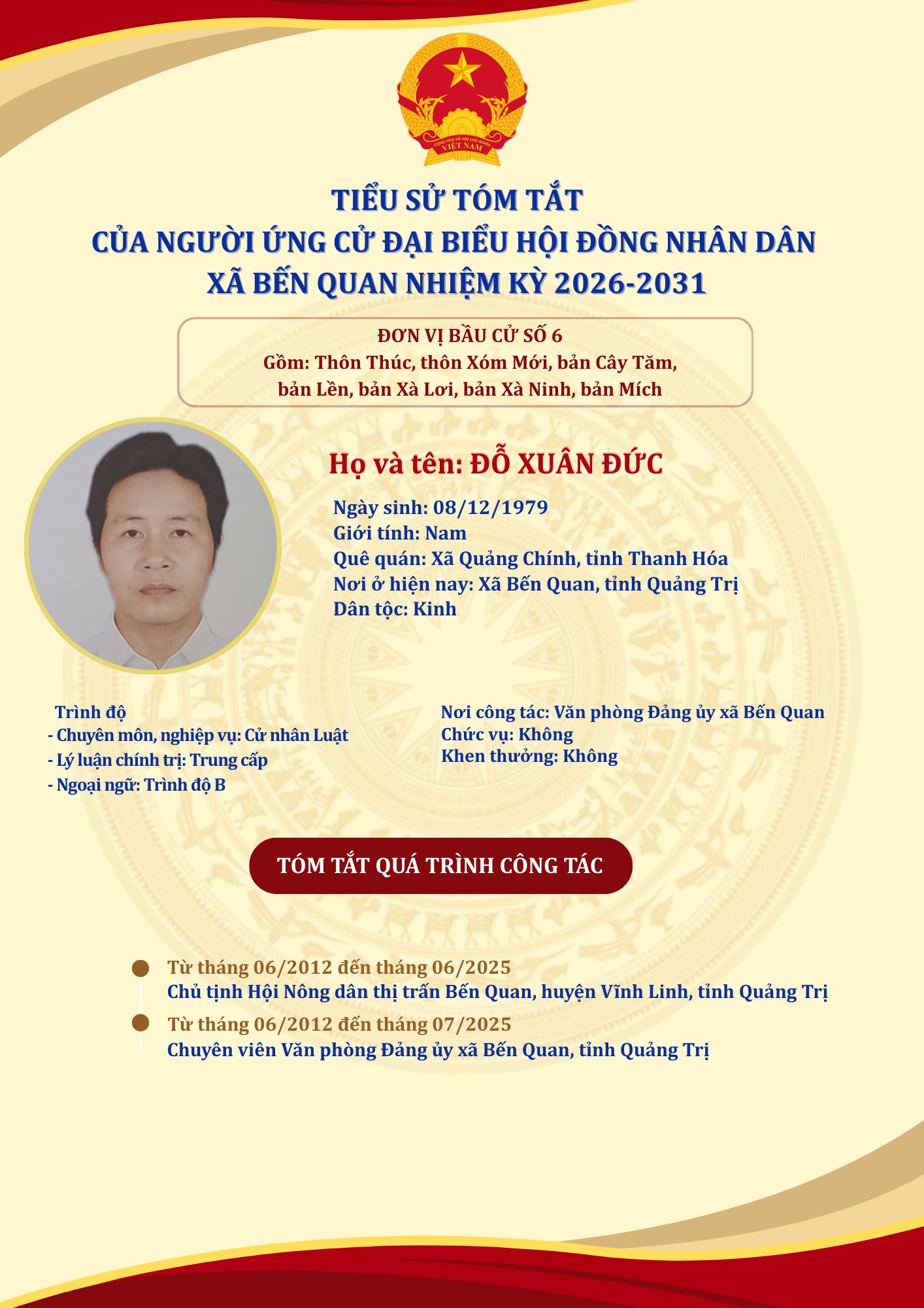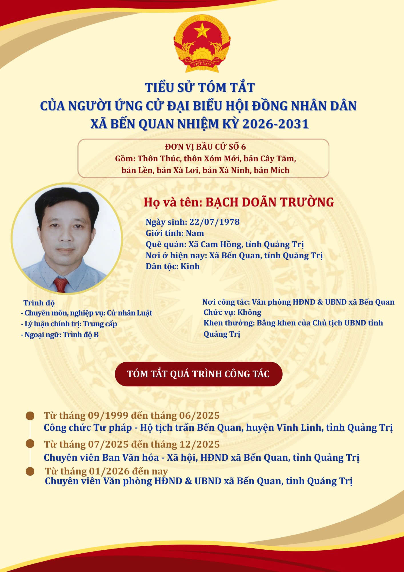 TIỂU SỬ TÓM TẮT CỦA NGƯỜI ỨNG CỬ ĐẠI BIỂU HỘI ĐỒNG NHÂN DÂN XÃ BẾN QUAN NHIỆM KỲ 2026-2031