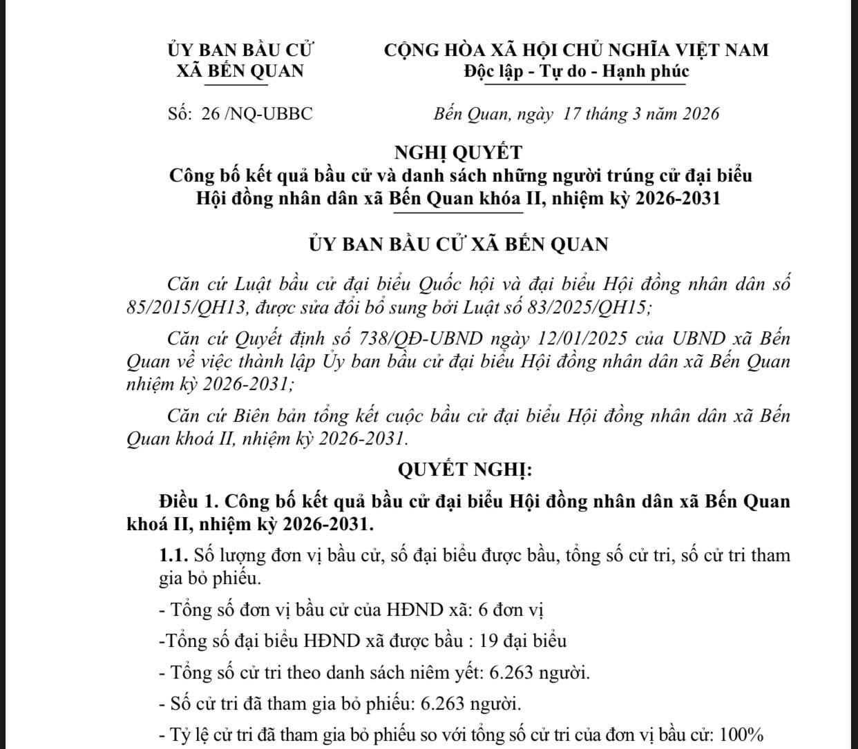 Căn cứ Luật bầu cử đại biểu Quốc hội và đại biểu Hội đồng nhân dân số 85/2015/QH13, được sửa đổi bổ sung bởi Luật số 83/2025/QH15; Căn cứ Quyết định số 738/QĐ-UBND ngày 12/01/2025 của UBND xã Bến Quan về việc thành lập Ủy ban bầu cử đại biểu Hội đồng nhân dân xã Bến Quan nhiệm kỳ 2026-2031; Căn cứ Biên bản tổng kết cuộc bầu cử đại biểu Hội đồng nhân dân xã Bến Quan khoá II, nhiệm kỳ 2026-2031