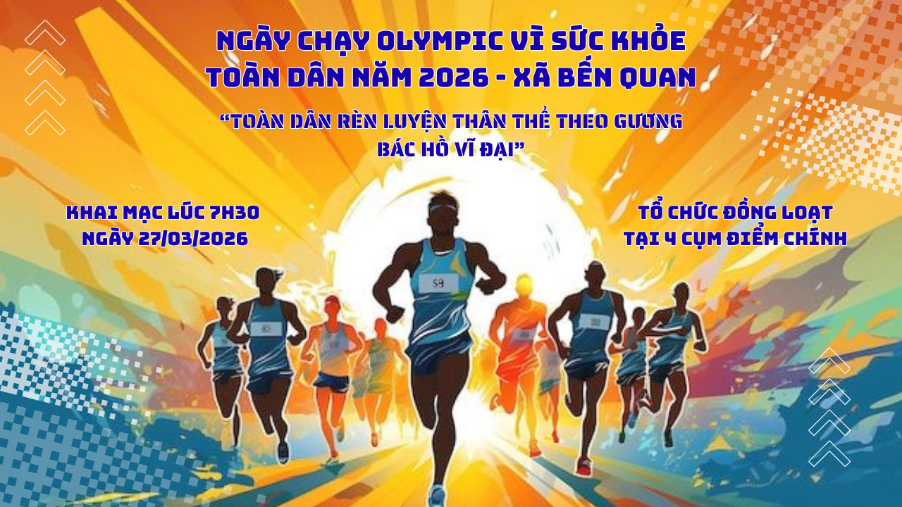 Thực hiện Kế hoạch số 321/KH-UBND ngày 03/3/2026 của UBND xã về việc Tổ chức Lễ phát động Cuộc vận động “Toàn dân rèn luyện thân thể theo gương Bác Hồ vĩ đại” và Ngày chạy Olympic vì sức khỏe toàn dân trên địa bàn xã Bến Quan. Trung tâm Dịch vụ tổng hợp xã tổ chức Lễ phát động và trân trọng kính mời: