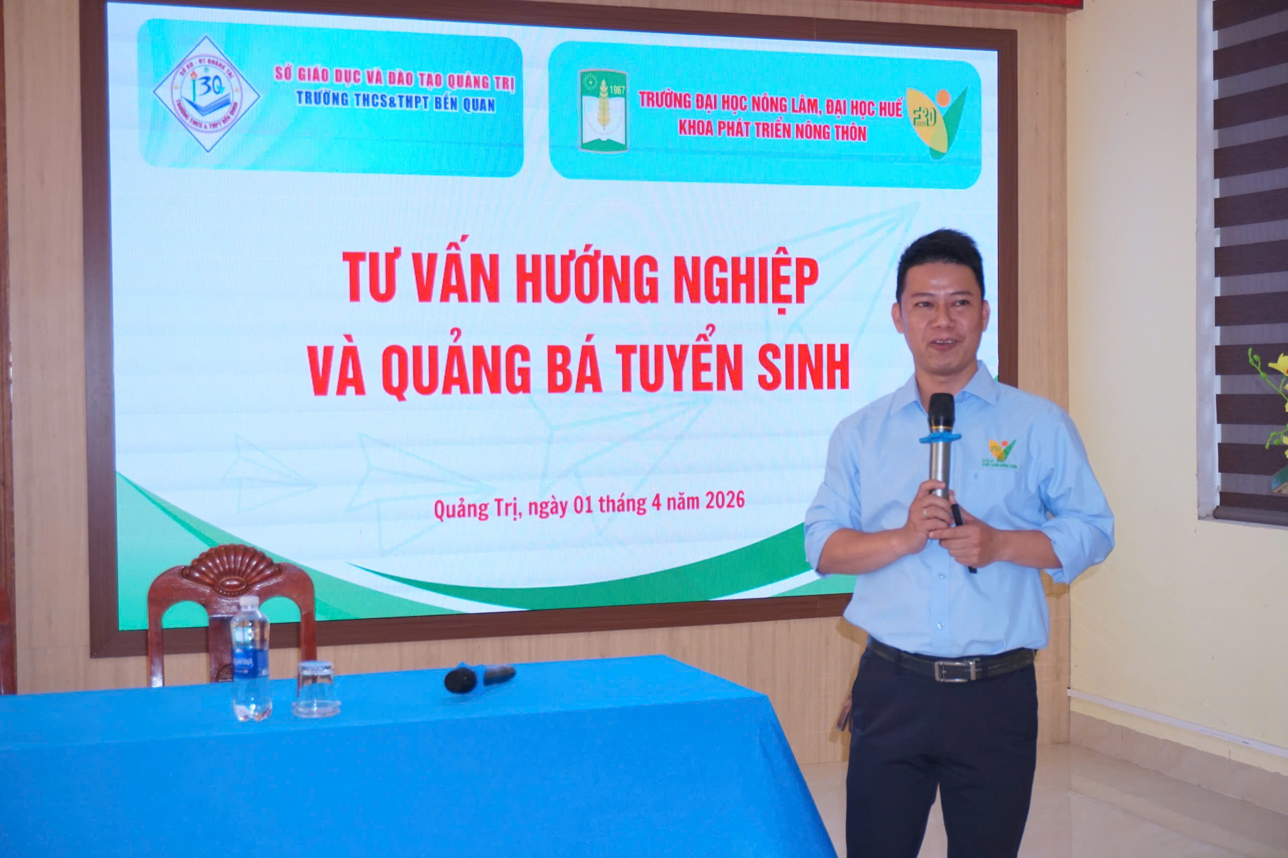 Sáng 1/4 , Trường Đại học Nông Lâm – Đại học Huế, đặc biệt là Khoa Phát triển nông thôn đã phối hợp tổ chức chương trình tư vấn hướng nghiệp và quảng bá tuyển sinh tại Trường THCS và THPT Bến Quan.